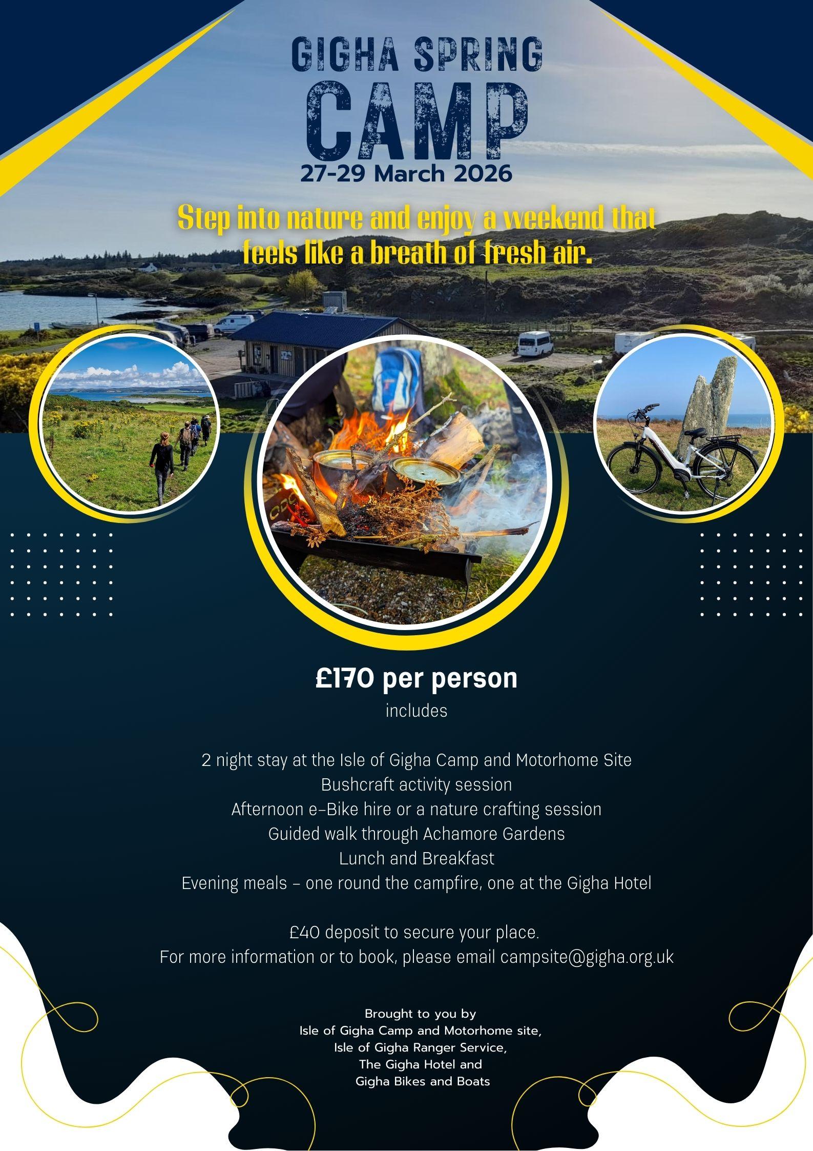 - Gigha Spring Camp: 27-29 March 2026 - Campfires, bushcraft, exploration, bike rides and good grub - contact us for more info.
